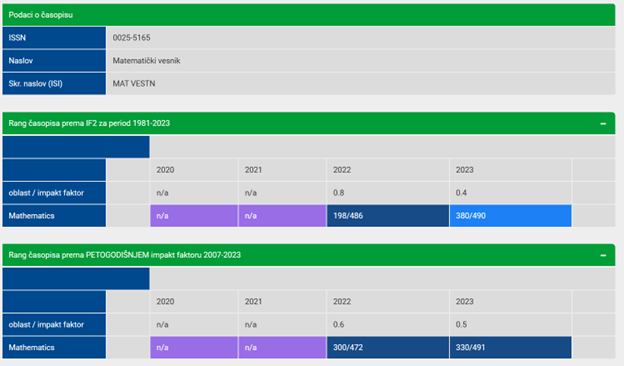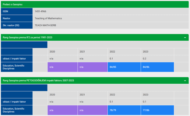 Математички весник и Teaching of Mathematics категорисани као међународни часописи М22 и М23